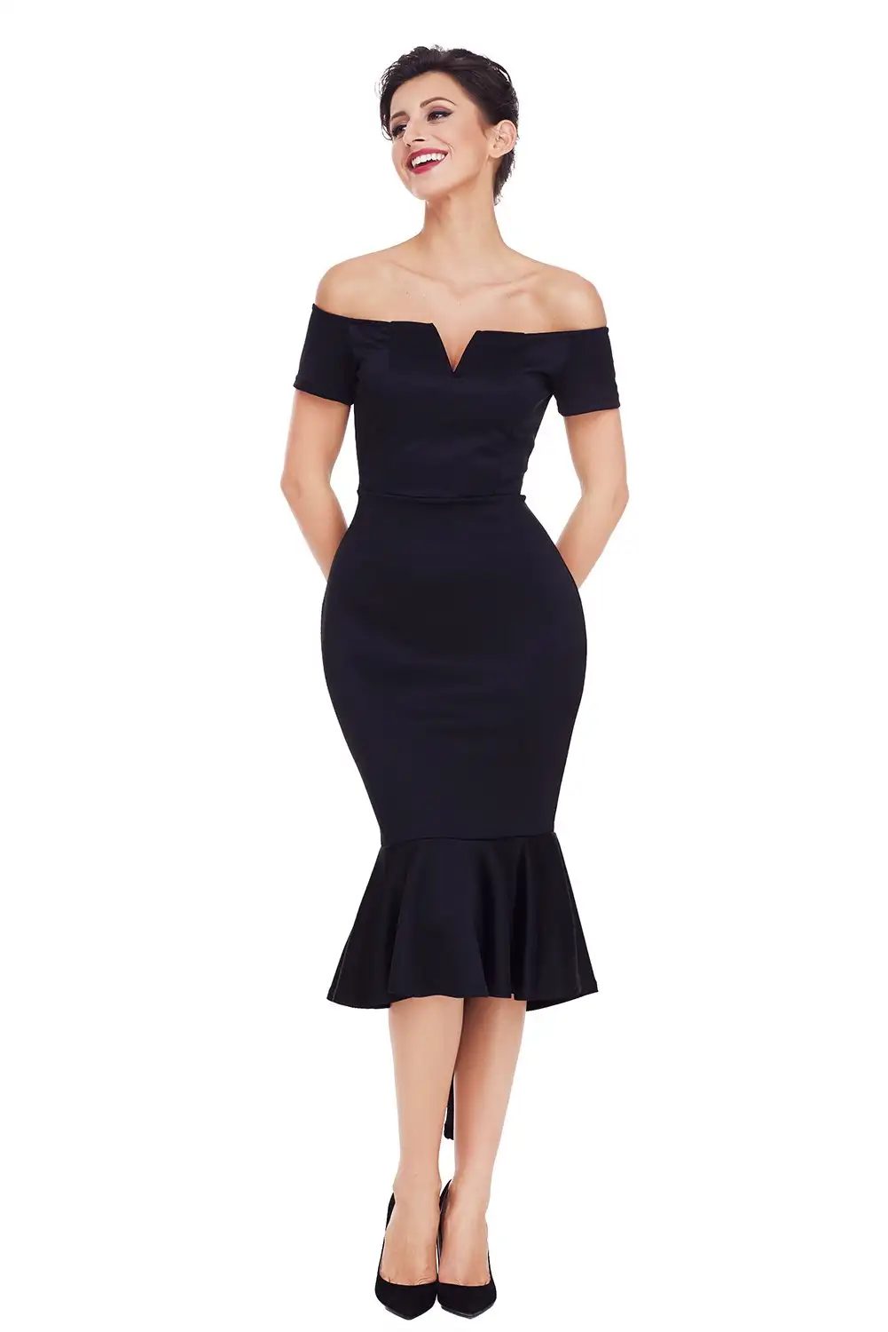 Černé pouzdrové midi šaty dlouhé ke kolenům, vyrobené jsou z umělého materiálu 95% polyester a 5% spandex,u kolen mají ozdobný volán vzadu popuštěn níže. Šaty nemají klasická ramínka mají je svěšená pod ramena a vytvořeny jsou tak čtvrtinové rukávy, výstřih je decentní tvaru V, na zádech je zip do pasu. Černé pouzdrové midi šaty nabízené ve velikostech S až XL a jsou dostupné v dalších barevných variantách.
