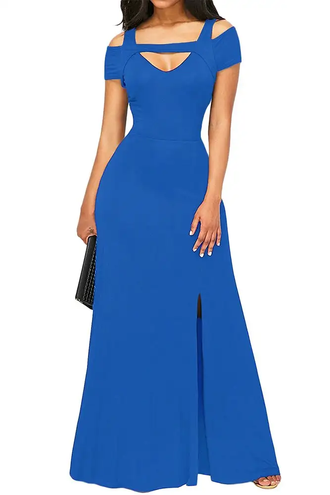 Modré dlouhé šaty bez rukávů s velmi elegantně řešenými ramínky a mini rukávky. Formální společenské modré šaty pro každou ženu nabízené ve velikostech S, M, L a XL dle rozpisu velikostí, materiál použitý na modrých šatech je 95% polyester a 5% spandex. Šaty nabízíme za velmi přívětivou nízkou cenu pouze my na obleč se sexy, šaty jsou vhodné do společnosti třeba na plesy. Nabízíme také další barevné provedení těchto elegantních modrých společenských dlouhých šatů.